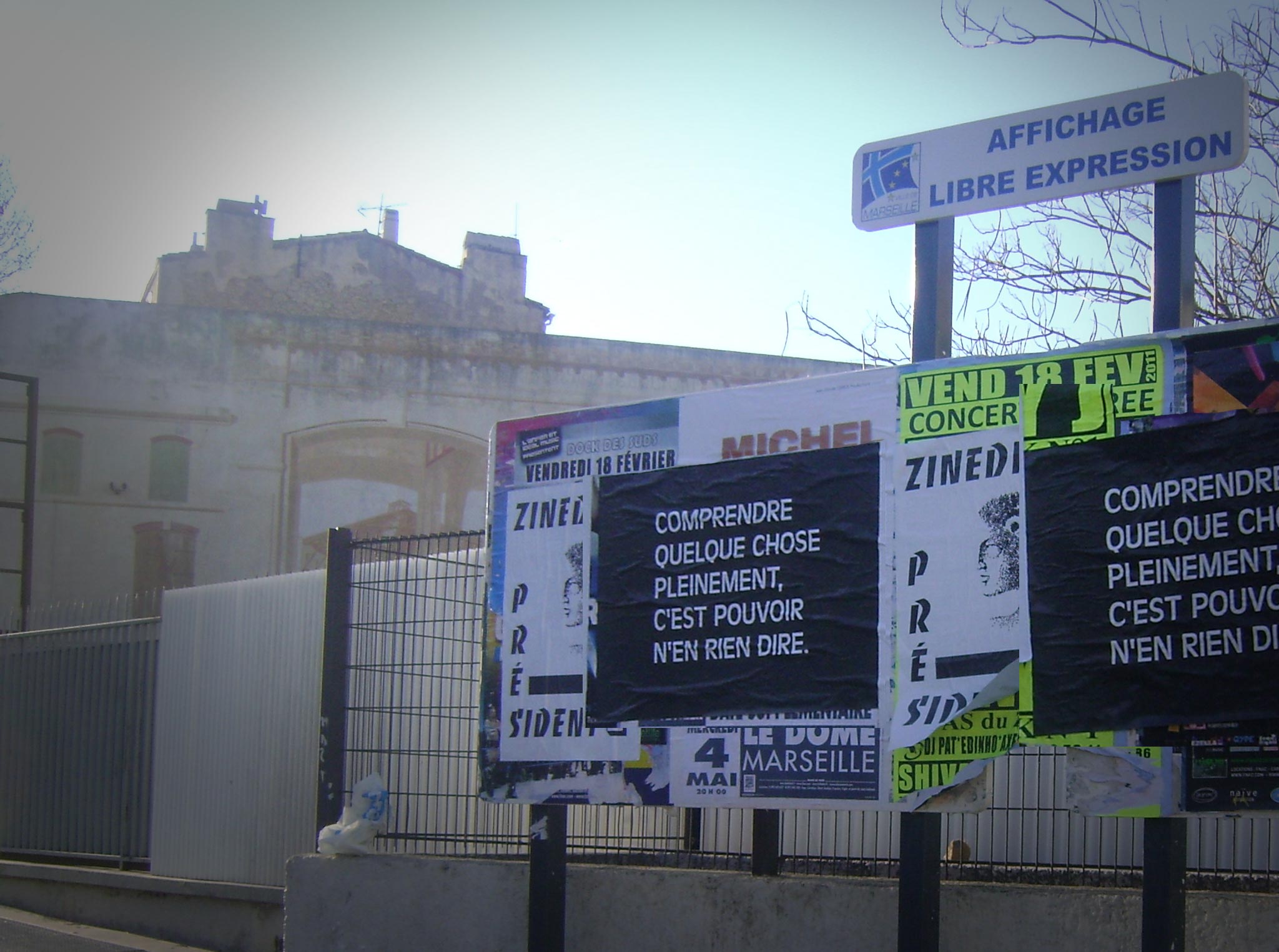 The completed text posters were exhibited at Galerie IFF, Marseille, and flyposted on Affichage Libre Expression sites throughout the city from December 2010-February 2011.